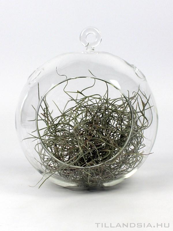 16,5cm átmérőjű felfüggeszthető üvegben lévő Tillandsia usneoides. A dekoratív airplant kompozíció kellemes és dekoratív pontja lehet otthonunknak, nappalinknak, étkezőnknek, vagy akár fürdőszobánknak vagy konyhánknak. Kitűnő ajándék lehet bármilyen alkalomra.